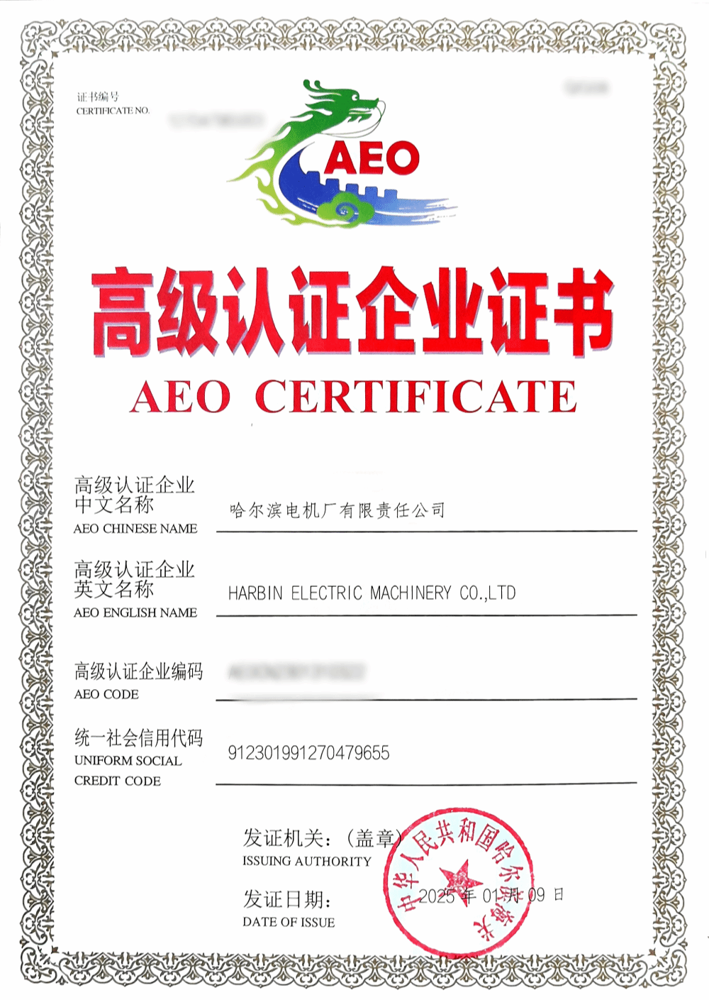 近日,哈尔滨电机厂有限责任公司获得海关AEO高级认证。1月13日,哈尔滨海关举办高级认证企业(AEO)颁证仪式暨政策宣讲会,为电机公司等企业颁发了《AEO高级认证企业证书》。